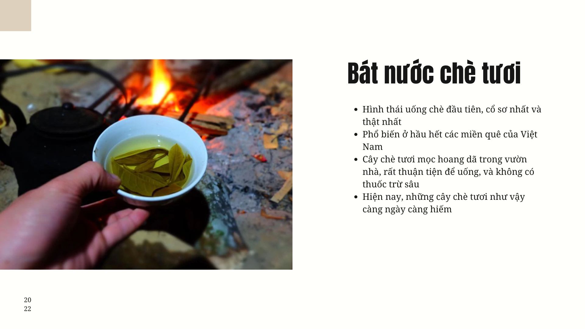 Trước khi trà được giới quý tộc để mắt, trở thành cống phẩm, rồi thương phẩm như hiện nay, trà có địa vị cũng như mọi loại thảo mộc khác trong vườn nhà. Nếu ở Nhật Bản hay Trung Quốc, trà đã mất đi vẻ ban sơ này, thì ở các vùng quê Việt Nam, nước chè vẫn là thức uống không có định giá, hoặc có giá rất rẻ. Và nhờ thế, nó trở thành một trường hợp để khảo sát và tìm hiểu về mối quan hệ giữa con người và tự nhiên khi chưa có thương mại chen vào. Khi trà chưa được đóng hộp, chưa mang trong nó thứ uy tín của vùng cao hay nhãn hiệu danh tiếng, thì nó tồn tại như đúng bản chất của nó: một loài cây có ích. Ở quê, người ta vẫn hái lá chè tươi mỗi sáng, vò sơ, đun sôi hoặc hãm trong nước sôi, rồi rót ra cốc lớn, dùng để uống cả ngày. Không cần ngồi thiền. Không cần chiêm ngưỡng sắc nước. Chỉ cần khát là có thể cảm nhận trọn vẹn hương vị của trà. Cách người Việt ở vùng nông thôn dùng trà vẫn còn giữ lại được phần nào sự hồn nhiên của thời chưa có phân tầng xã hội. Ở đó, không ai hỏi bạn đang uống trà gì. Họ chỉ rót thêm cho bạn một chén nữa. Cũng chính vì sự “không kiểu cách” này mà nước chè quê, thứ tưởng chừng đơn giản và dễ bị bỏ qua, lại là tấm gương phản chiếu rõ nhất về cách một cộng đồng sống với thiên nhiên: không chiếm đoạt, không tô vẽ, chỉ sống cùng và sử dụng vừa đủ.