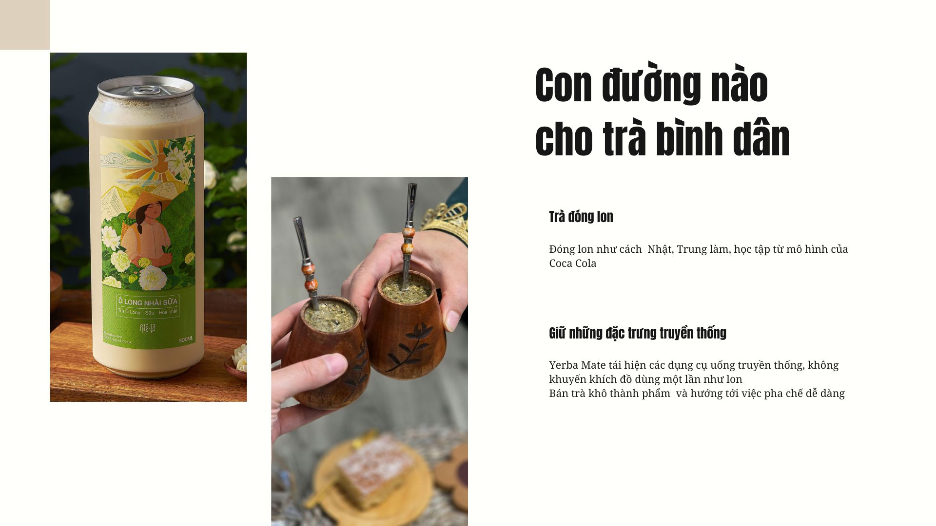 Vấn đề đặt ra là: làm sao để trà bình dân có chất lượng tốt hơn, và có thể thương mại hóa một cách hiệu quả hơn, mà không đánh mất hồn cốt dân dã? Ở đây, tôi muốn học hỏi từ mô hình của yerba mate. Khác với cách mà người Nhật hay người Trung đóng lon trà để thuận tiện và tiết kiệm thời gian, người Nam Mỹ vẫn giữ lại những thao tác, vật dụng và điểm nhấn cơ bản khi yerba mate bước ra thị trường: bình đựng, ống hút kim loại, cách chia sẻ. Họ không biến yerba mate thành một sản phẩm công nghiệp vô hồn, họ thương mại hóa một truyền thống chứ không phải thương mại hóa lá trà.
